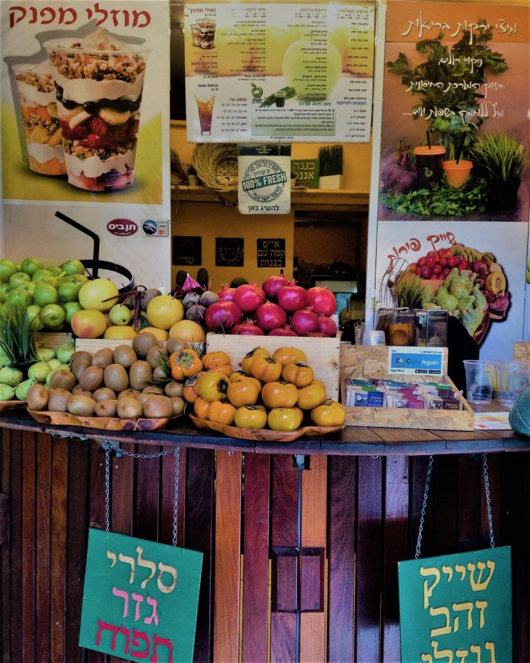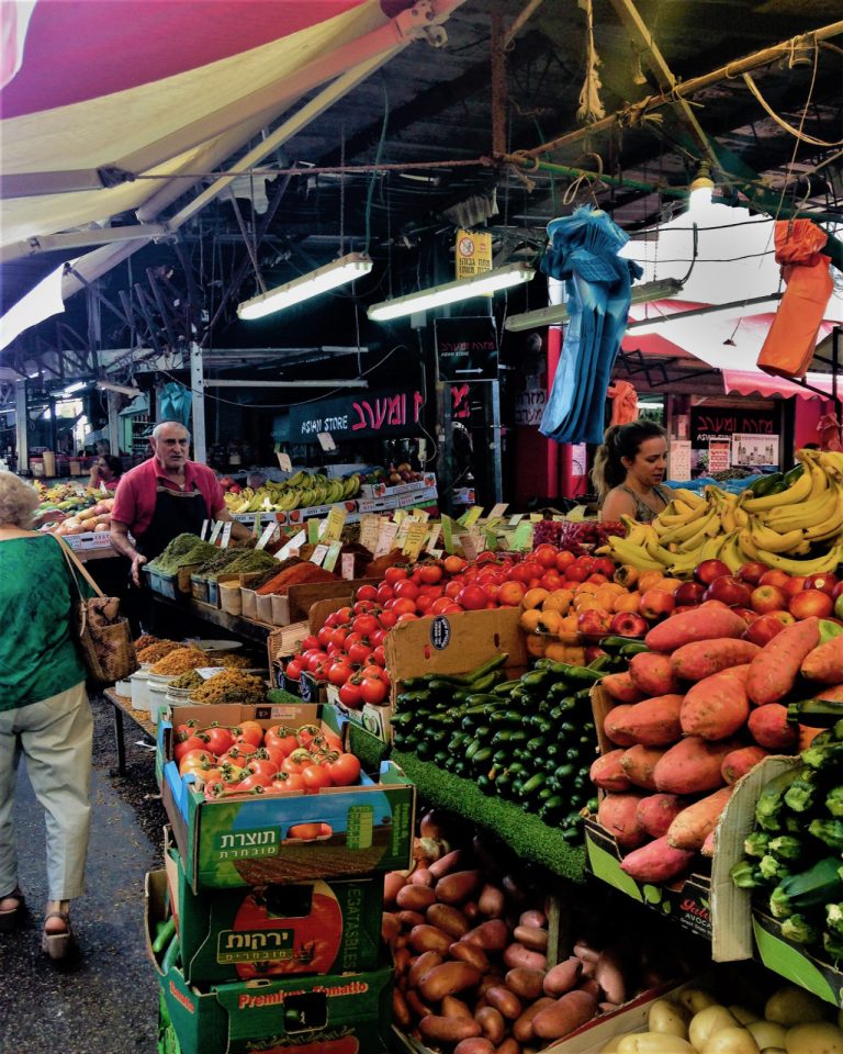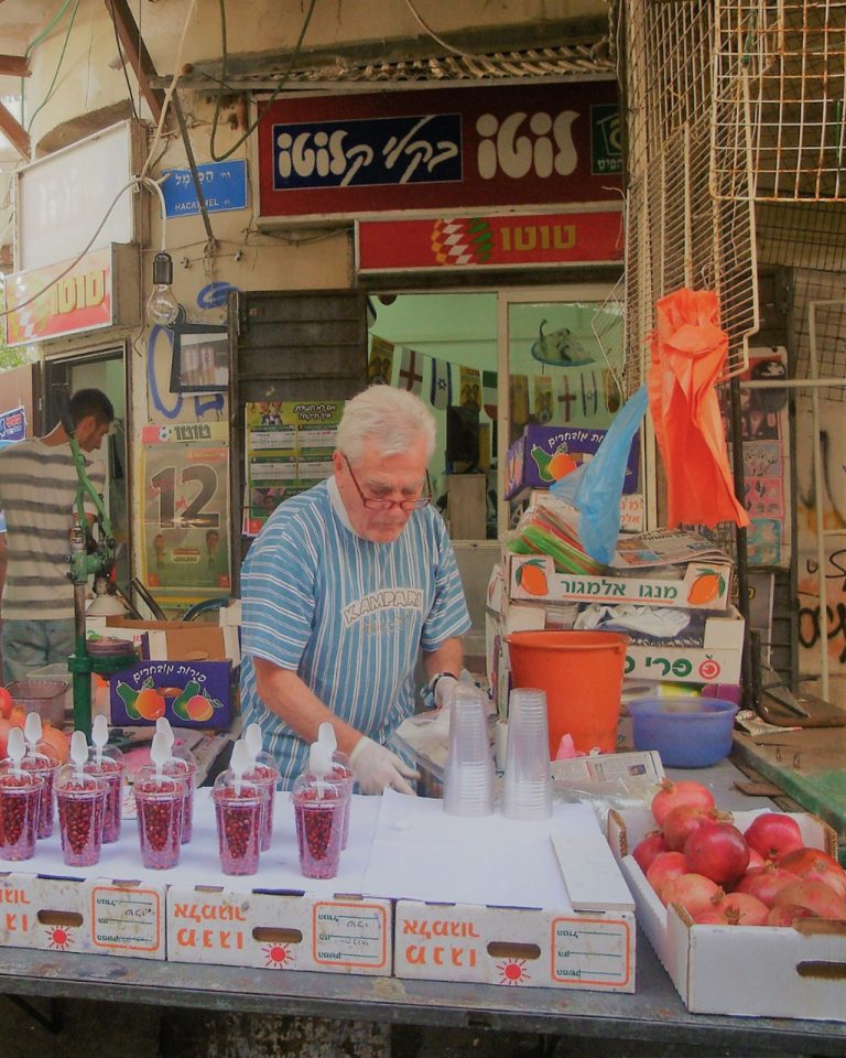 Per colazione mi fermo a uno dei tanti chioschi della frutta agli angoli della città per un frullato di melograno, uno dei simboli della religione israelitica, l’elisir di questa terra, un tempo fiore all’occhiello dei commerci della nobiltà terriera palestinese. Poi procedo verso il grande forno kosher Lehamim in Hashmonaim 103, l’ideale per gustare dolci locali e pane appena sfornato, nonché uno dei migliori challah, il dolce dello Shabbat, ossia il giorno di festa della settimana ebraica che inizia il venerdì sera. La mattinata prosegue al Carmel Market, lo storico mercato cittadino, il regno dello street food, della contrattazione, e delle bancarelle di oggettistica spiccia. Una favola un po’ sopravvalutata nelle comuni guide turistiche.