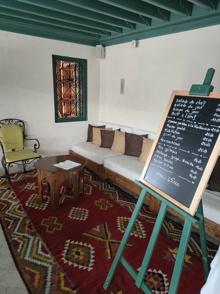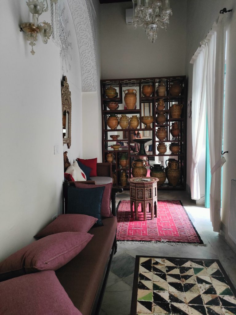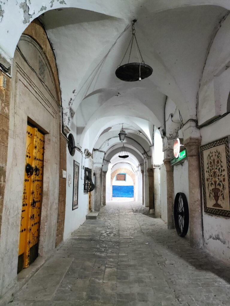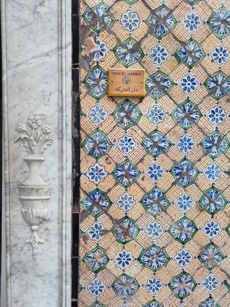 Our dar is tucked away in the meanders of the Medina of Tunis, so how do we get there? It takes us about a couple of hours to cover the 4 km or so that separate us from the Cathedral of St Vincent de Paul to the Kasbah Square. We proceed at a walking pace, mopeds and cars shamelessly touch each other, at road crossings the precedence of pedestrians reigns over that of motor vehicles, which easily turn the wrong way, car parks are occupied by clothing stalls, mopeds are very adept at slalom, we communicate with each other strictly by signalling with gestures out of the windows, car arrows are perhaps forbidden? Then street vendors of prickly pears, jasmine, corn on the cob appear, heading towards the square of the Royal Victoria Hotel, the former British Embassy. Why not, at one point even a football ball cuts us off, there are several children playing on the side of the road, between one stall and another. We arrive at the Kasbah multi-storey car park, rather dark, perhaps a little sinister. We are stopped by some (abusive?) parking attendants, I say that I don’t have Tunisian dinars, “je vien de arriver a Tunis, désolé!”, but they wave me through, it doesn’t matter, I can proceed. But how do you pay? Mah, at the exit maybe there’s a guy who will ask us to pay, there, inside a bushel. What happens now though, do the guys from before smash our car? Who knows.