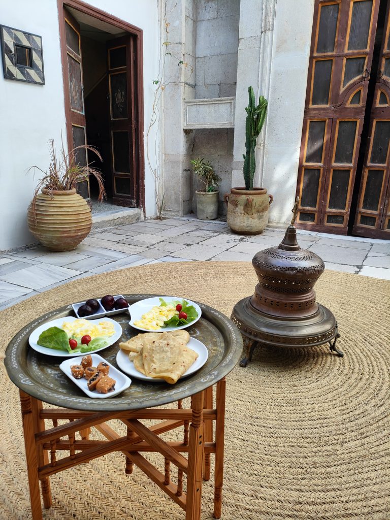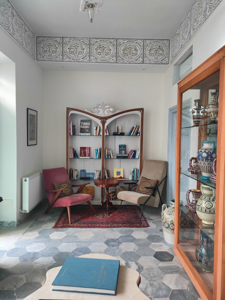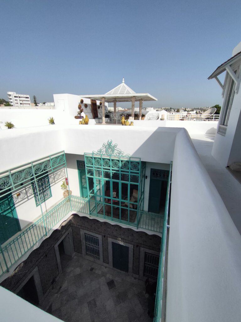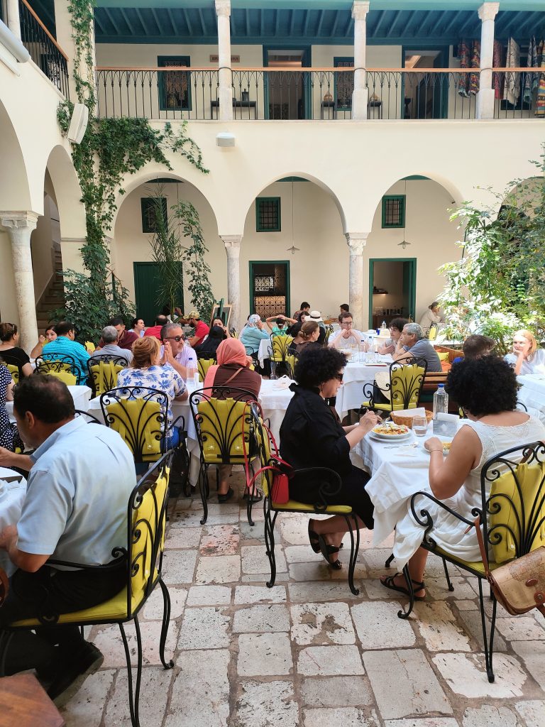 Our dar is tucked away in the meanders of the Medina of Tunis, so how do we get there? It takes us about a couple of hours to cover the 4 km or so that separate us from the Cathedral of St Vincent de Paul to the Kasbah Square. We proceed at a walking pace, mopeds and cars shamelessly touch each other, at road crossings the precedence of pedestrians reigns over that of motor vehicles, which easily turn the wrong way, car parks are occupied by clothing stalls, mopeds are very adept at slalom, we communicate with each other strictly by signalling with gestures out of the windows, car arrows are perhaps forbidden? Then street vendors of prickly pears, jasmine, corn on the cob appear, heading towards the square of the Royal Victoria Hotel, the former British Embassy. Why not, at one point even a football ball cuts us off, there are several children playing on the side of the road, between one stall and another. We arrive at the Kasbah multi-storey car park, rather dark, perhaps a little sinister. We are stopped by some (abusive?) parking attendants, I say that I don’t have Tunisian dinars, “je vien de arriver a Tunis, désolé!”, but they wave me through, it doesn’t matter, I can proceed. But how do you pay? Mah, at the exit maybe there’s a guy who will ask us to pay, there, inside a bushel. What happens now though, do the guys from before smash our car? Who knows.