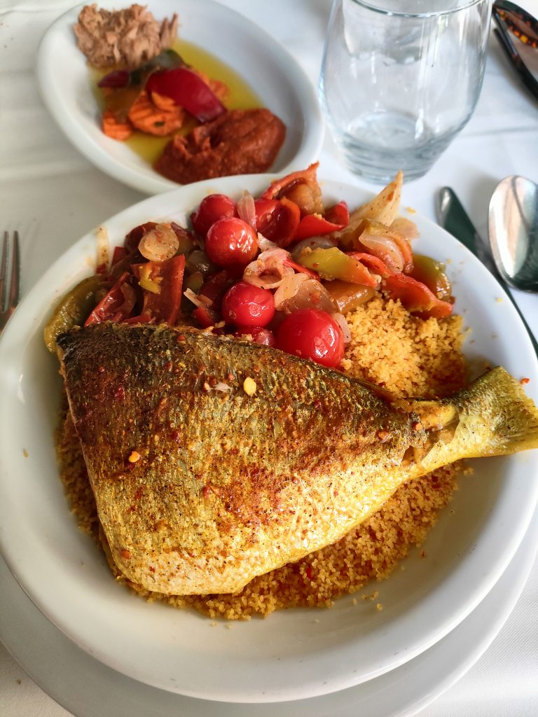 The principle of every dar, be it minute, imposing, sophisticated or meagre, is that all the bedrooms, the kitchen, the storerooms, overlook a large inner courtyard, which is the most fascinating place, the one I prefer. It is where, thanks to a large skylight, one can enjoy natural light, where one can take a nap amidst orange blossoms and placid little fountains, and where breakfast is served, always very rich: fresh figs, watermelon, melon, grapes, eggs, salad, halva, sugary juices, rivers of coffee, mint tea, and mlawi bread, a kind of very tasty crescia accompanied by very sweet jams. There we meet a girl who offers to take us to lunch, perhaps we are looking a little lost. We choose the Fondouk El Attarine, a caravanserai rehabilitated into a luxurious restaurant, craft centre, tea room. My travelling companion is assertive ‘I want to stay here, here is good for me’. At our table, kabkabou, aka the first of a long series of fish stews in tomato sauce, and fish couscous, spicy. The fish is placed, in its entirety, right on top of the well-known pile of shelled pellets. Sophisticated mise en place.