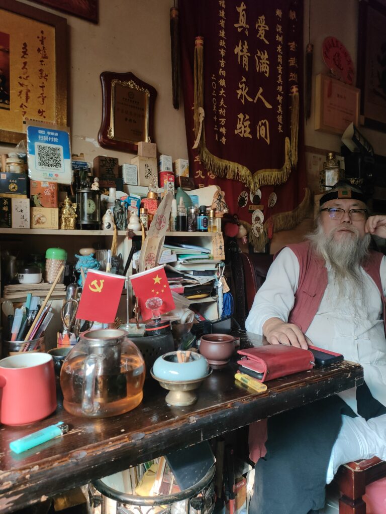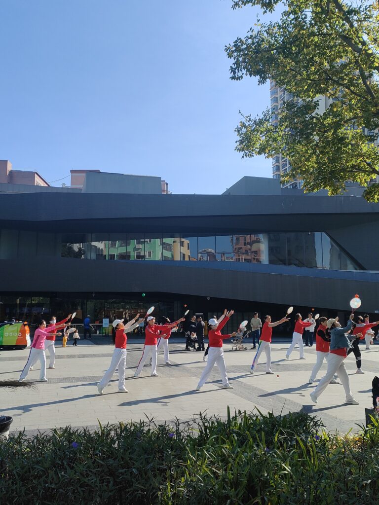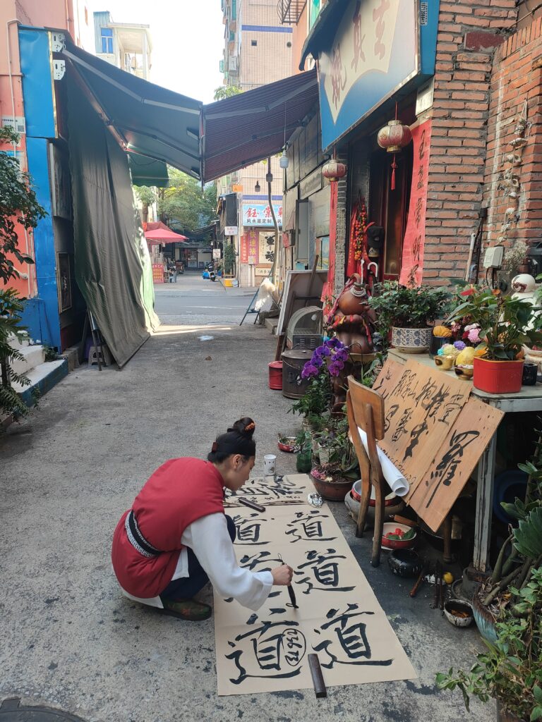 Ho intravisto un briciolo di caos in questa società super pianificata alla Dafen Oil Painting Village. Ci sono arrivata il mattino presto, imbattendomi in un serafico moto ondoso di signore che praticavano il tai chi. Accanto a loro, le prime botteghe iniziavano a disporre i propri manufatti tradizionali, prima che i negozi di copie di quadri occidentali attirassero il brusio. In un vicolo simile a una calle veneziana, una signorina stava dipingendo in silenzio le lettere del Tao su un rotolo di carta. Un monaco taoista e due signori mi hanno invitato per un té e per una sigaretta. A gesti mi hanno spiegato che la signora era rimasta incinta per via delle magie del monaco taoista. Hanno acceso una lanterna e dell’incenso di fronte a me per celebrare l’evento, prima che mi augurassero buona fortuna in fase di congedo. Una scena sciamanica e mistica che ho ritrovato la sera rincasando a Nanshan, nelle vie alberate che profumavano d’estate per quanto fosse novembre. Nel mio quartiere i mercati della frutta tropicale brulicavano di golosi ladri di durian, mentre all’angolo del mio hotel si ritrovavano sotto un tendone delle famiglie che condividevano su una lunga tavolata un’enorme anatra arrostita e lunghe sessioni del lento rituale del té. Alla reception ho trovato la stessa ragazza che mi aveva accolto il primo giorno, che dopo averci scattato una foto su WeChat per inviarla al suo fidanzato ci ha tenuto a condividere una tazza di té assieme. Del poco che ho osservato della Cina ho intravisto dei moti ancora lenti, misurati, amichevoli, delle tradizioni che non vogliono cessare di esistere, una spiritualità e un rispetto per lo straniero, gli antenati e il passato che spero riusciranno a custodire il passato e la bellezza millenaria di un paese che non merita di essere formattato, plasmato e direzionato da un’ ideologia, quanto dal concetto di armonia che ho appreso dal Tao.