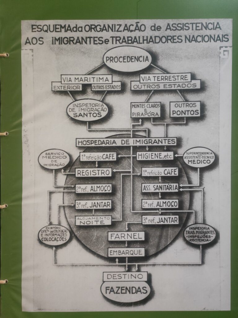 Sono venuta a San Paolo proprio per conoscere il percorso dei miei progenitori veneti, quelli che dalla seconda metà del Novecento attraccarono jn massa al porto di Santos, il florido porto del Caffè. Da qui si imbarcavano sul treno per San Paolo, e giungevano nel quartiere Bras, presso l’Hospedaria dos Migrantes, oggi anche detto il Memorial. Era un luogo di speranza, di arrivo, di delusione, l’Ellis Island paulista. Alle pareti ci sono ancora le indicazioni in italiano verso la foresteria e la mensa, dove leggo nelle tovaglie d’epoca magna che te fa bene! Dopo qualche giorno, a volte mese, potevano partire per le fazende e iniziare la raccolta del caffè. Dal 1850 era stata abolita in Brasile la tratta degli schiavi africani, contraccolpo per i baroes do cafè, che dovettero reclutare repentinamente nuova manodopera. Dai documenti d’epoca i fazendeiros ci descrivevano come “grandi lavoratori”, diversi dagli immigrati giapponesi “troppo diversi”, forse è per questo che i nipponici si dedicarono ad altro, a partire dalle strade attorno a Praca da Libertade, ancor’oggi loro roccaforte in città. I veneti esportarono in Brasile la polenta, parlavano il talian, una lingua veneto-brasiliana che introdusse nel linguaggio corrente parole come sopa, formaio, capeleti, si riunirono nell”Associazione San Marco”, fino a quando alcuni se ne andarono in Argentina ed Uruguay, con la prima crisi del caffè. In totale, tra il 1887 e il 1978 passarono per l’Hospedaria circa 2 milion di persone tra italiani, portoghesi, giapponesi, coreani, libanesi. Nella lobby del museo incontro un nonno con la nipote. Studia genealogia, è venuta qui per tracciare il percorso dei suoi antenati tramite l’Archivio digitale del Memorial. Chissà quanti e dove sono i miei, una volta avevo scovato un nutrito gruppo facebook “I Zecchin in Brasil”. Credo che ora visiterò  i luoghi degli italiani che hanno deciso di restare, quelli che nella telenovela dei primi anni Duemila Terra Nostra hanno contribuito a creare l’immaginario sugli italo-brasiliani.