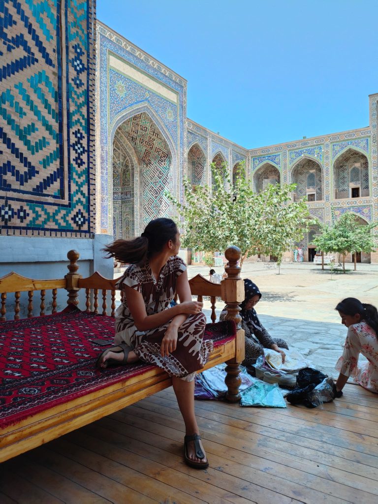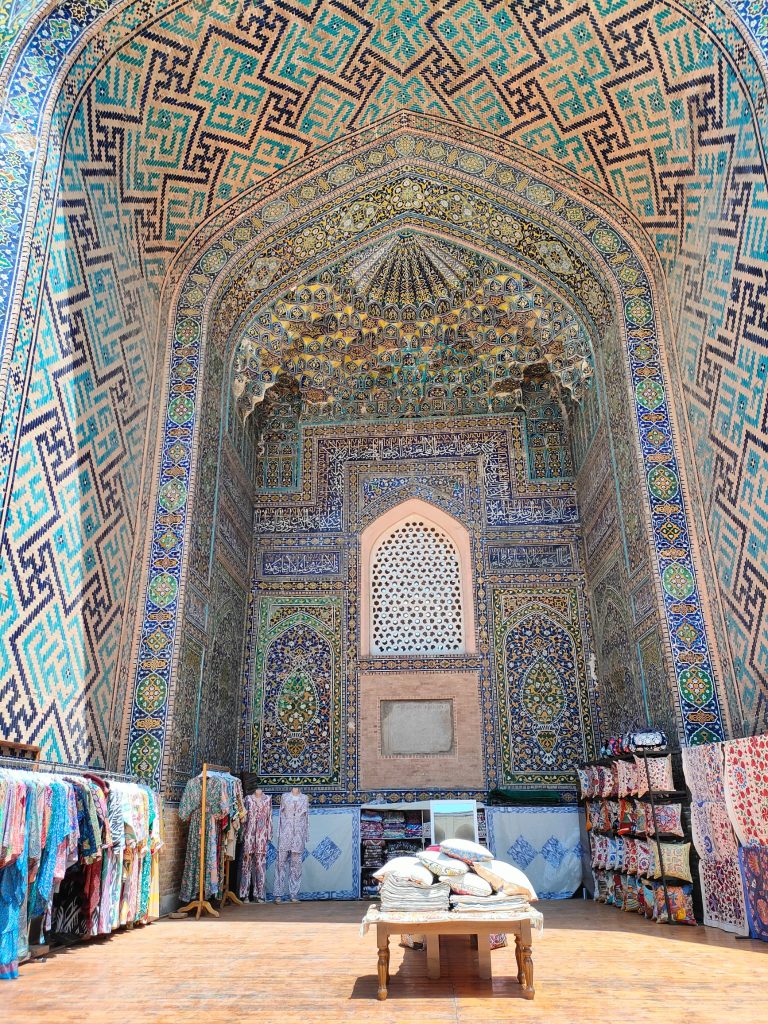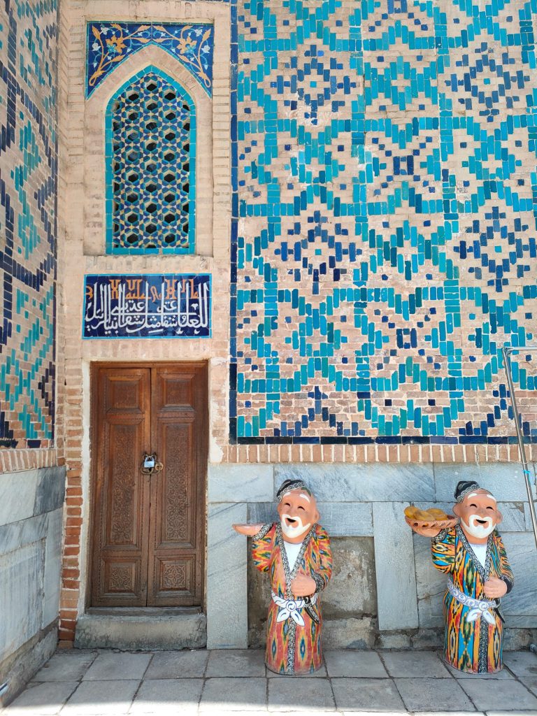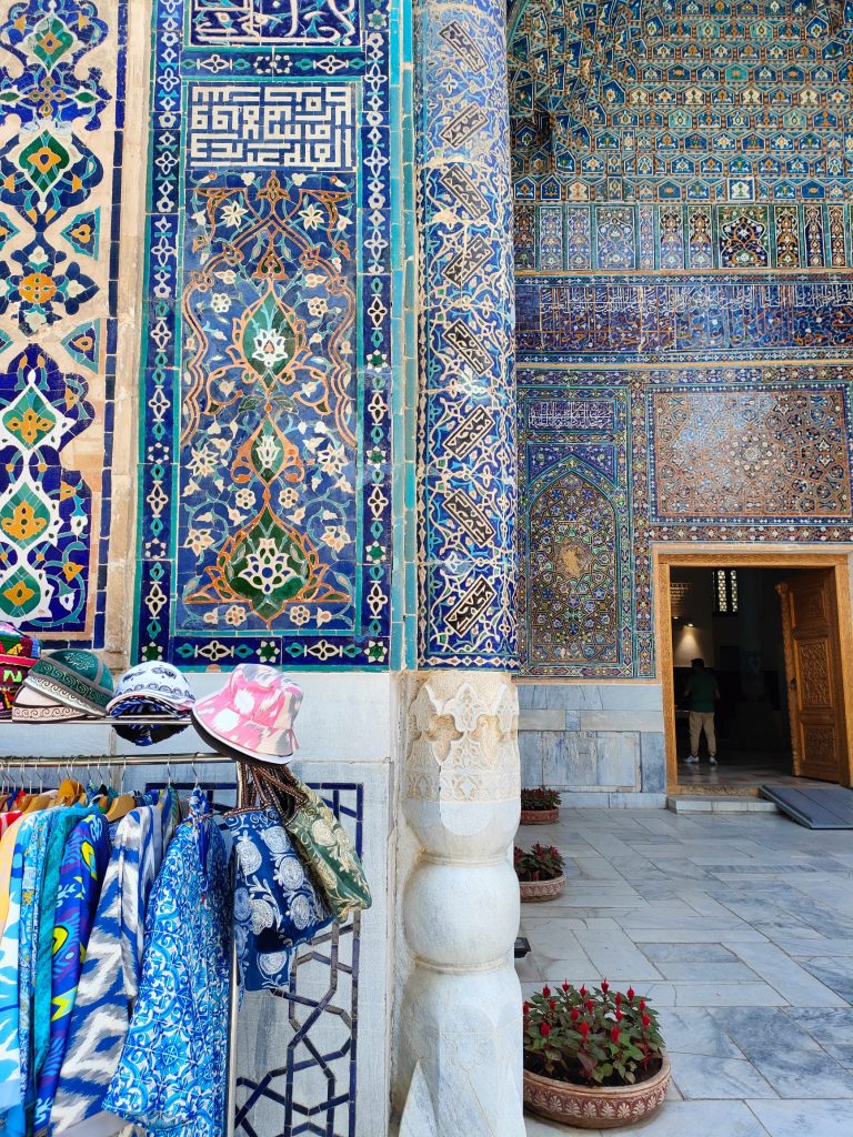Si tratta di un complesso di maestose madrase, la Madrasa di Ulugbek (la più antica). Situata nel lato occidentale del Registan, questa madrasa fu terminata nel 1420 durante il regno dell’omonimo sovrano, famoso studioso di astronomia, noto anche al coevo Occidente. Le pareti e il portale del monumento riflettono il suo amore per l’astronomia attraverso numerose stelle intarsiate. Le altre due madrase che compongono il Registan sono la Madrasa Rivestita d’Oro e la Madrasa del Leone, quest’ultima contravvenente il divieto di rappresentazione islamico, sul portale si distinguono appunto due preziosi leoni dorati. L’intero sito è straordinario, le decorazioni policrome, floreali, oniriche, che insistono particolarmente sul colore blu, contribuiscono ad eccedere le aspettative che la mia fame di esotismo aveva fomentato. Samarcanda è vera, qui di fronte a me, e i suoi abitanti siedono comodi sul cortile interno del palazzo, gli uomini portando quei variopinti cappellini uzbeki a uncinetto, le donne avvolgendo i capelli in morbidi tessuti. Gli uni vendono tappeti e stoffe nelle ex stanze adibite ad aule studio delle madrase, gli altri si accovacciano scalzi su una sorta di letti matrimoniali per riposare; alcune donne siedono a terra con le figlie per esporre delle sciarpe, altri bevono il tè su delle terrazzine, o intagliano sul legno dei simpatici gnomi caratteristici. Ognuno si fa gli affari propri, placidamente, quando incrocio i loro volti sembrano così atarassici, in pace, sembra che sorridano, seppure in realtà non lo facciano, è come se ci fosse una barriera invalicabile tra me e loro nonostante risulti così facile ricevere la loro serenità.