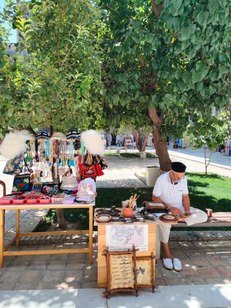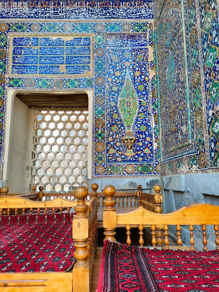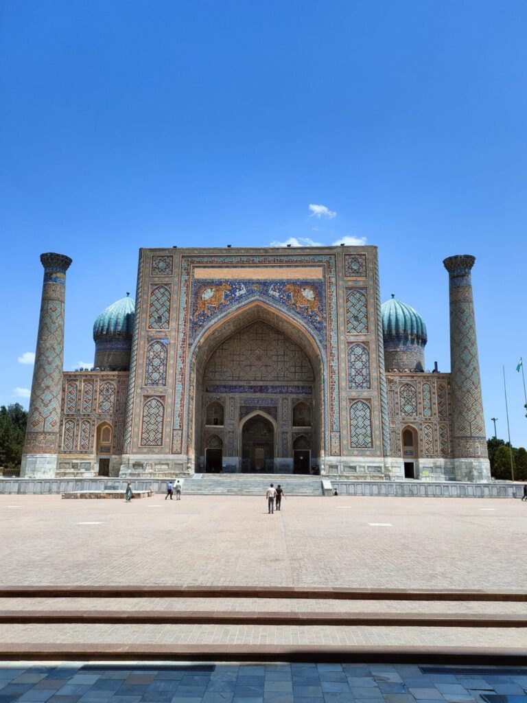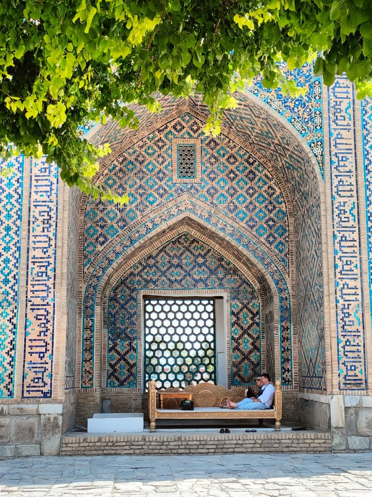 Si tratta di un complesso di maestose madrase, la Madrasa di Ulugbek (la più antica). Situata nel lato occidentale del Registan, questa madrasa fu terminata nel 1420 durante il regno dell’omonimo sovrano, famoso studioso di astronomia, noto anche al coevo Occidente. Le pareti e il portale del monumento riflettono il suo amore per l’astronomia attraverso numerose stelle intarsiate. Le altre due madrase che compongono il Registan sono la Madrasa Rivestita d’Oro e la Madrasa del Leone, quest’ultima contravvenente il divieto di rappresentazione islamico, sul portale si distinguono appunto due preziosi leoni dorati. L’intero sito è straordinario, le decorazioni policrome, floreali, oniriche, che insistono particolarmente sul colore blu, contribuiscono ad eccedere le aspettative che la mia fame di esotismo aveva fomentato. Samarcanda è vera, qui di fronte a me, e i suoi abitanti siedono comodi sul cortile interno del palazzo, gli uomini portando quei variopinti cappellini uzbeki a uncinetto, le donne avvolgendo i capelli in morbidi tessuti. Gli uni vendono tappeti e stoffe nelle ex stanze adibite ad aule studio delle madrase, gli altri si accovacciano scalzi su una sorta di letti matrimoniali per riposare; alcune donne siedono a terra con le figlie per esporre delle sciarpe, altri bevono il tè su delle terrazzine, o intagliano sul legno dei simpatici gnomi caratteristici. Ognuno si fa gli affari propri, placidamente, quando incrocio i loro volti sembrano così atarassici, in pace, sembra che sorridano, seppure in realtà non lo facciano, è come se ci fosse una barriera invalicabile tra me e loro nonostante risulti così facile ricevere la loro serenità.