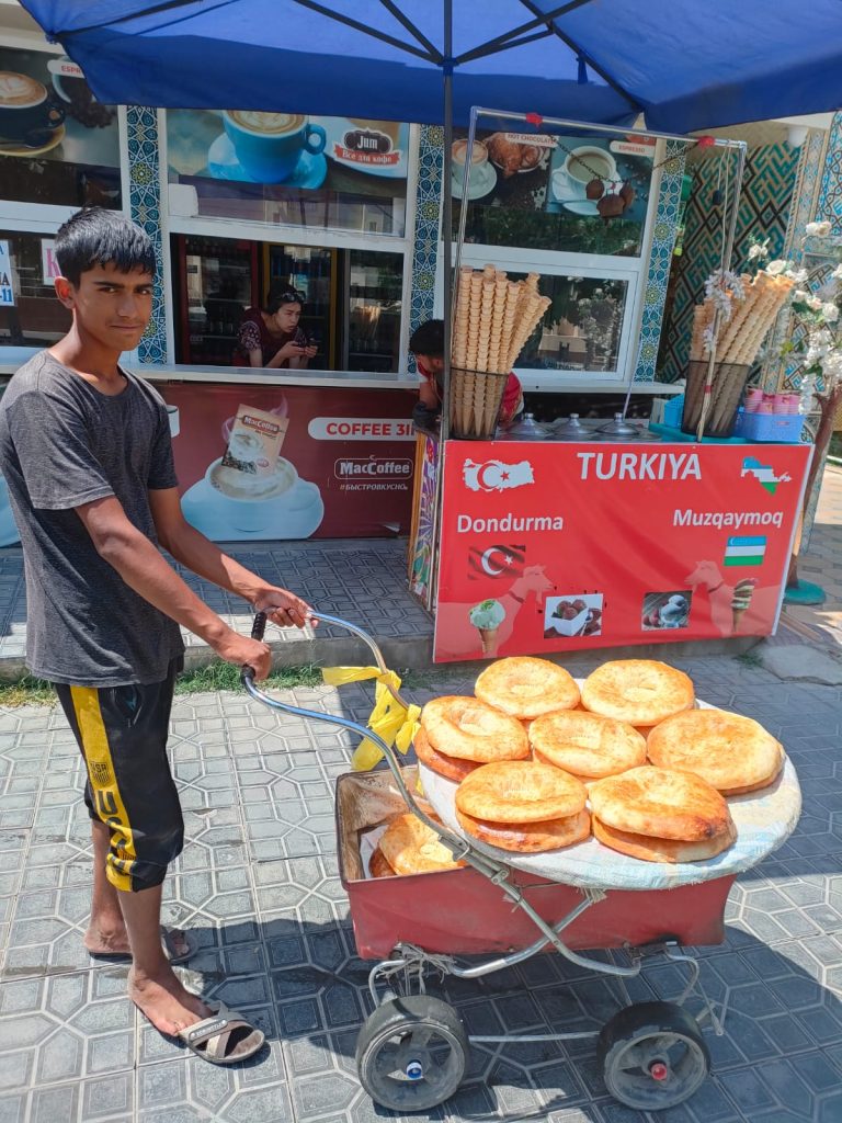 A Samarcanda mi aspetta un autista dal nome impronunciabile, occhietti allungati e simpatici, solita frangetta corvina che va di moda da queste parti, parla bene inglese, ha lavorato in Uk per anni in un pub. La stazione tenta di ricordare il palazzo del Registan nelle tonalità, o quantomeno i sovietici ci hanno provato. Rivedo lo spilungone, che mi sorride, e poi cambio strada, oggi non prevedo di dedicare del tempo a fare nuove conoscenze. Dopo poco sono alla Caffetteria Chocolat per il mio appuntamento, dove spicca una bizzarra Sachertorte senza l’ombra di cioccolato, chissà, forse sarà la ricetta uzbeka. Pranzo a base di riso pilaf, mi rimetto in moto, dirigendomi verso il palazzo del Registan. Le strade di Samarcanda sono un dejavu, mi ricordano il quartiere dove vivevo a Baku. Pianta stradale ortogonale, buche qua e là dove potrei facilmente amputarmi una gamba, gatti gattini o gattacci ovunque. Parchi cementificati, ahimè, caykhane qua e là, venditori ambulanti di pane, che lo stoccano e trascinano in carriole. I samovar fumanti si accostano ai doner, con quell’aroma invitante che viene voglia di addentare sotto gli ombrelloni della Coca Cola. Ed ecco qui rinchiusi appunto, in un angolo di città, le anime del Paese: carovaniera, post-russa, turanica, araba, timidamente occhieggiante all’ occidente. Propri come i caratteri che compaiono qua e là, cirillico, latino, arabo. La lingua è un altro segno di questa commistione: La lingua maggioritaria, tagika (un dialetto del farsi), si affianca all’uzbeko turanico parlato nel resto del paese, al russo, lingua franca di comunicazione intergenerazionale e internazionale, e all’inglese. In fondo, siamo nel maggior raccordo commerciale di terra tra Cina e Europa, un carrefour per eccellenza, non a caso Alessandro Magno conquistò la città giusto qualche secolo fa, e ne rimase ammaliato, divenne la “terza Alessandria”.