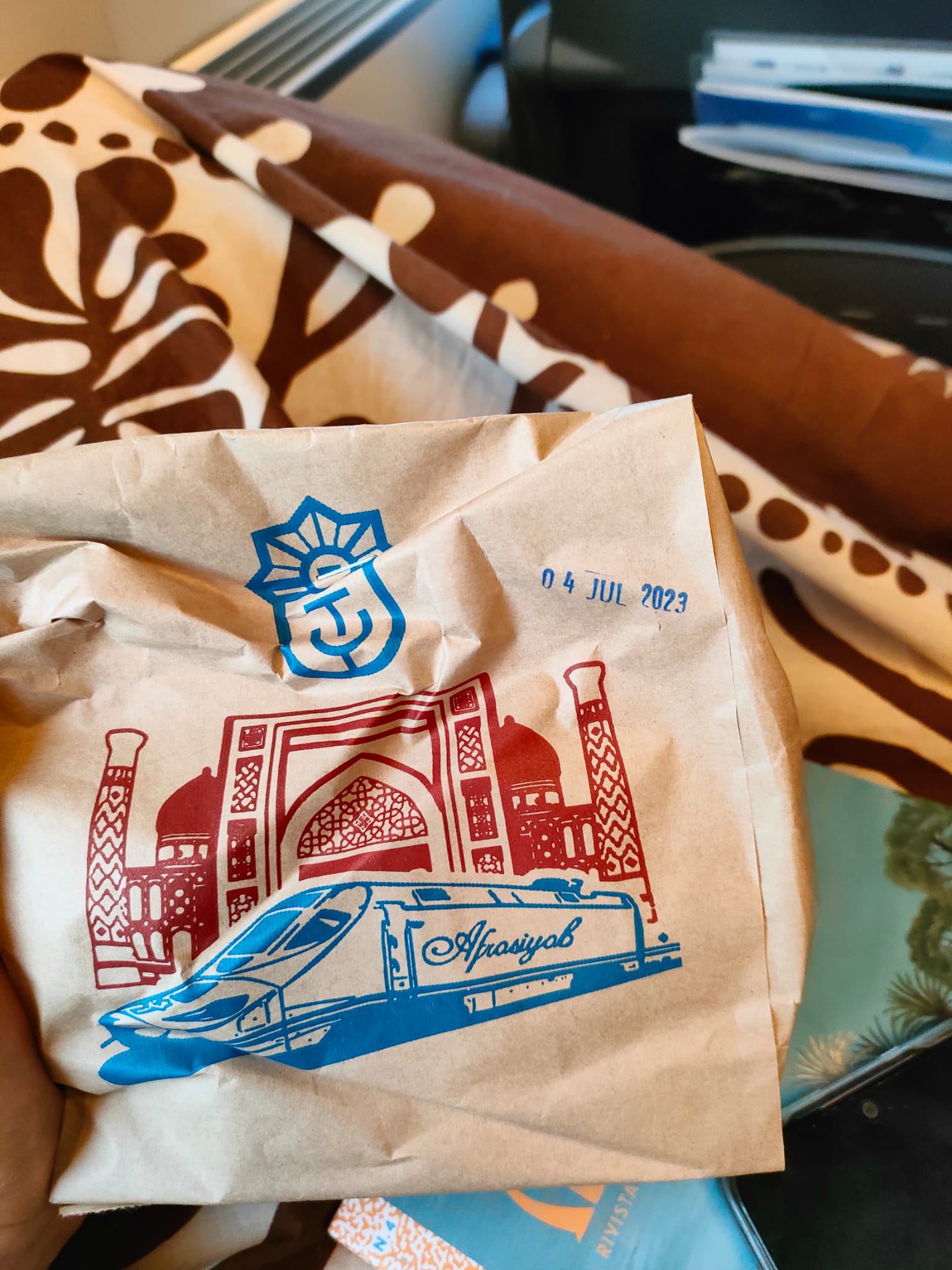 Alcuni sgranocchiano, come di consueto da queste parti, i semi di girasole, altri prendono posto accatastando bagagli, bisacce, provviste di ogni sorta. Seppur sembri di essere all’interno di un grande centro commerciale, gli esercizi di fast food non esistono. Ci sono piuttosto delle sorte di stazioncine, di banchi del mercato, in cui si vendono al dettaglio le cose più svariate: ceste di pane uzbeko dal diametro esagerato, sigarette, succhi di melograno, giocattoli, fazzoletti, le iconiche barrette di cioccolato al latte con il famoso faccino di Alenka, direttamente da Mosca. Poi vedo spiccare un armadio a due ante, un marcantonio di due metri che prenderà il mio stesso treno Afrosiyob (l’antico nome di Samarcanda), che in due ore di alta velocita ci porterà a destinazione. Il treno è confortevole, così tanto che invece di immergermi nel paesaggio uniforme della steppa vengo risucchiata dall’imbuto del sonno, solo la signorina del tè mi sveglia per abbeverarmi e passarmi una merendina al sacco offerta dalla compagnia ferroviaria. D’altronde siamo sulla Via della Seta, il tè è rito, ritmo, contemplazione.