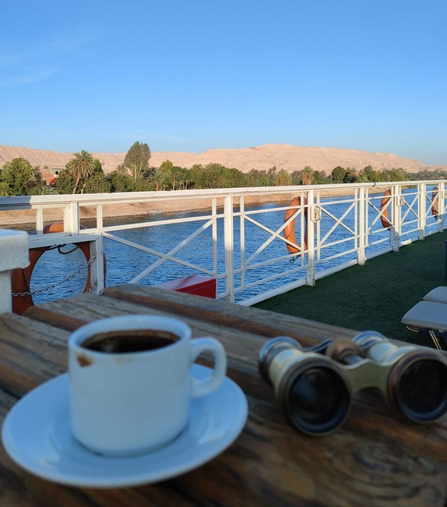Ogni giorno offrono il tè delle cinque sul ponte, qui nella motonave sul Nilo. I greci chiacchierano fino all’ora di sera, gli italiani si abbronzano in costume, spuntano anche alcuni tedeschi, sennò perché al buffet della crociera ci sarebbe la torta Linz? Siamo tutti sonnambuli, fluttuanti in un’atmosfera calda, ovattata, dopo una notte in bianco e una visita cocente alla Valle dei Re, ai tempi di Karnak e Luxor. “Sveglia alle 4.30” ci aveva detto Ahmed, la nostra guida, la sera precedente, all’aeroporto di Luxor.