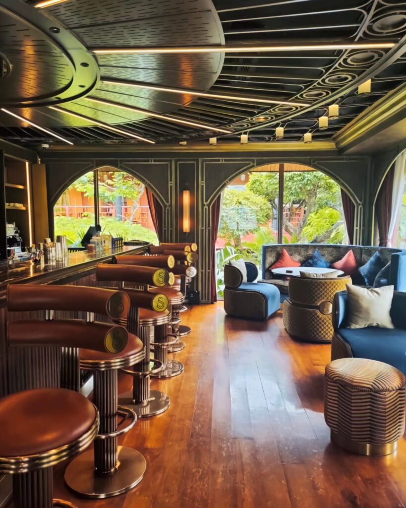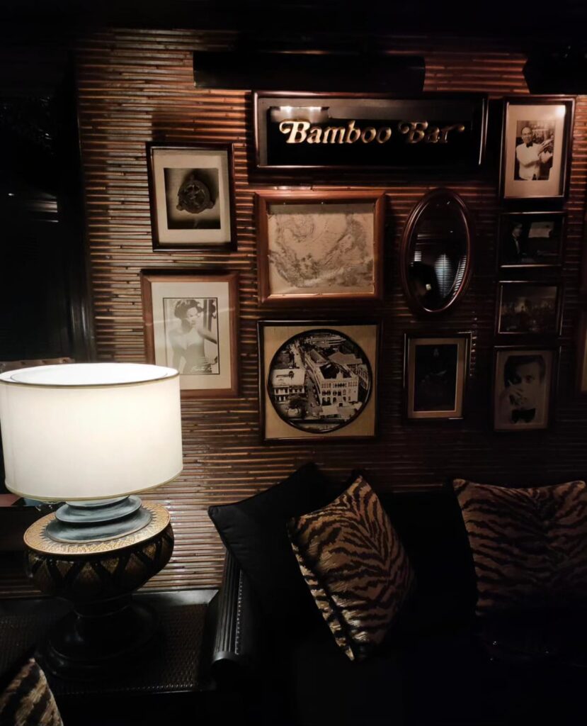 La fama senza tempo di questo bar deriva appunto dall’appartenenza a uno degli hotel più antichi dell’Asia, affacciato sul Chao Praya. C’è la cultura del lusso e il lusso della cultura. Il Mandarin Oriental è un luogo che mette in condizione di apprezzare il tempo che scorre, lo spazio culturale in cui il viaggiatore sofisticato può caricarsi di quello spirito asiatico che sta ridefinendo l’Oriente diffondendosi al contempo in Occidente. Un tempo era posseduto da Louis Thomas Leonowens, figlio della famosa Anna Leonowens, istitutrice del modernizzatore Re Mongkut negli anni del Trattato commerciale di Bowring (1855) tra Regno del Siam, Gran Bretagna e Irlanda. Il famigerato Bamboo bar è tuttora un’icona di Bangkok, dove i viaggiatori old money e gli esponenti dello star system si recano per osservare o essere notati. E’un luogo intensamente estetico, dove mi reco per immergermi in un’atmosfera da proibizionismo in allure orientale rivestita di legno scuro, sedie di rattan, tavoli in marmo e caratteristici ventilatori che sfumano gli effluvi dei sigari degli oziosi altolocati.  Un luogo perfetto per Jim Thompson, per i farang, (per me?), per gli stranieri viziati e viziosi da sempre sottoposti all’impietosa indagine radiologica dei locals.